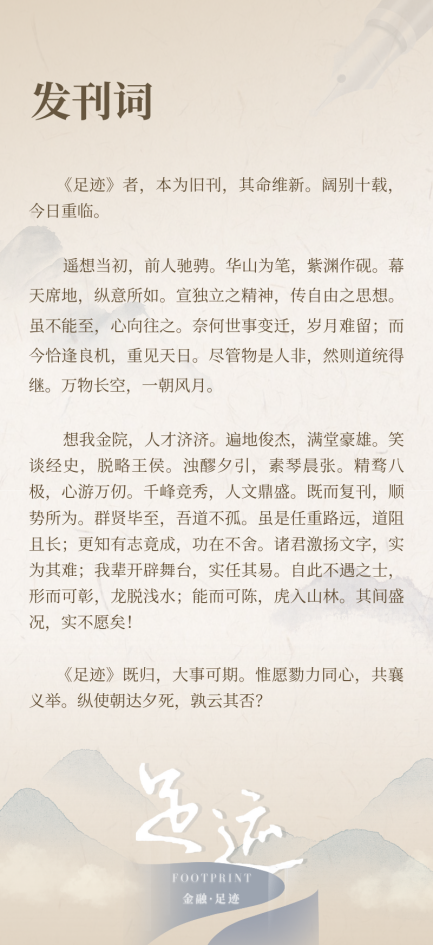 一时间,金院俊秀,汇聚于此。千峰竞秀,人文鼎盛。虽历经坎坷,阔别十载,《足迹》仍抓住良机,披荆斩棘,继往开来。