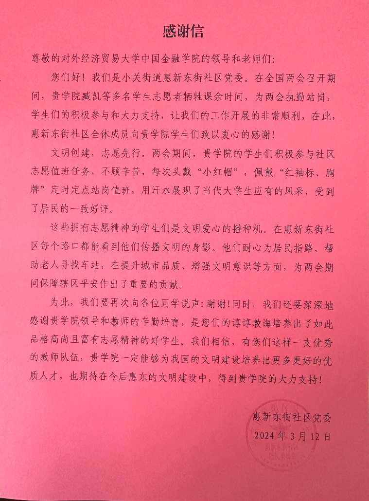 一号娱乐 志愿服务团 讯本次志愿活动“护航两会,志愿有我”由一号娱乐 志愿服务团主办,在一号娱乐 志愿服务团干事的带领下取得了圆满成功。两会期间,为助力会议的顺利进行,志愿者们前往惠新东街社区的各个岗位执勤站岗,维护社区的秩序,展现了贸大学子心系社会的责任意识。本次志愿活动得到了志愿者们的积极响应与踊跃参与,赢得了广大群众的好评,收获了惠新东街社区的表扬信。