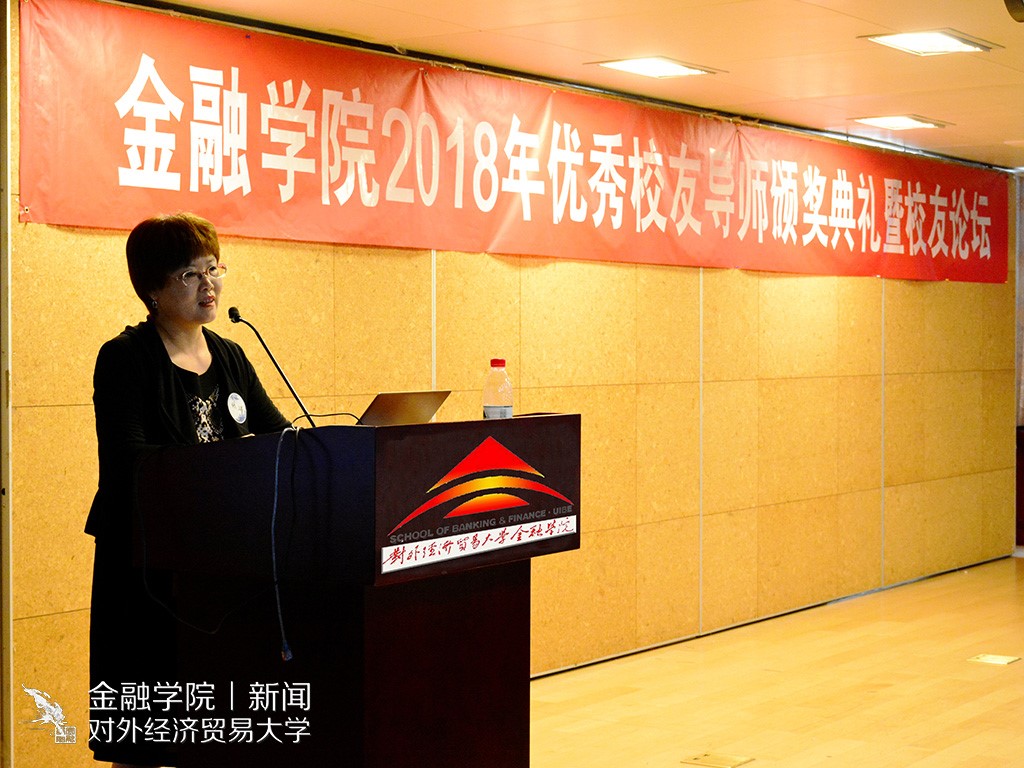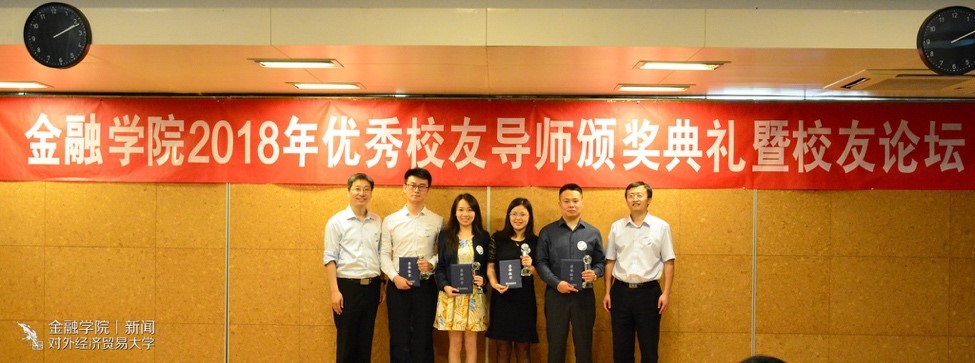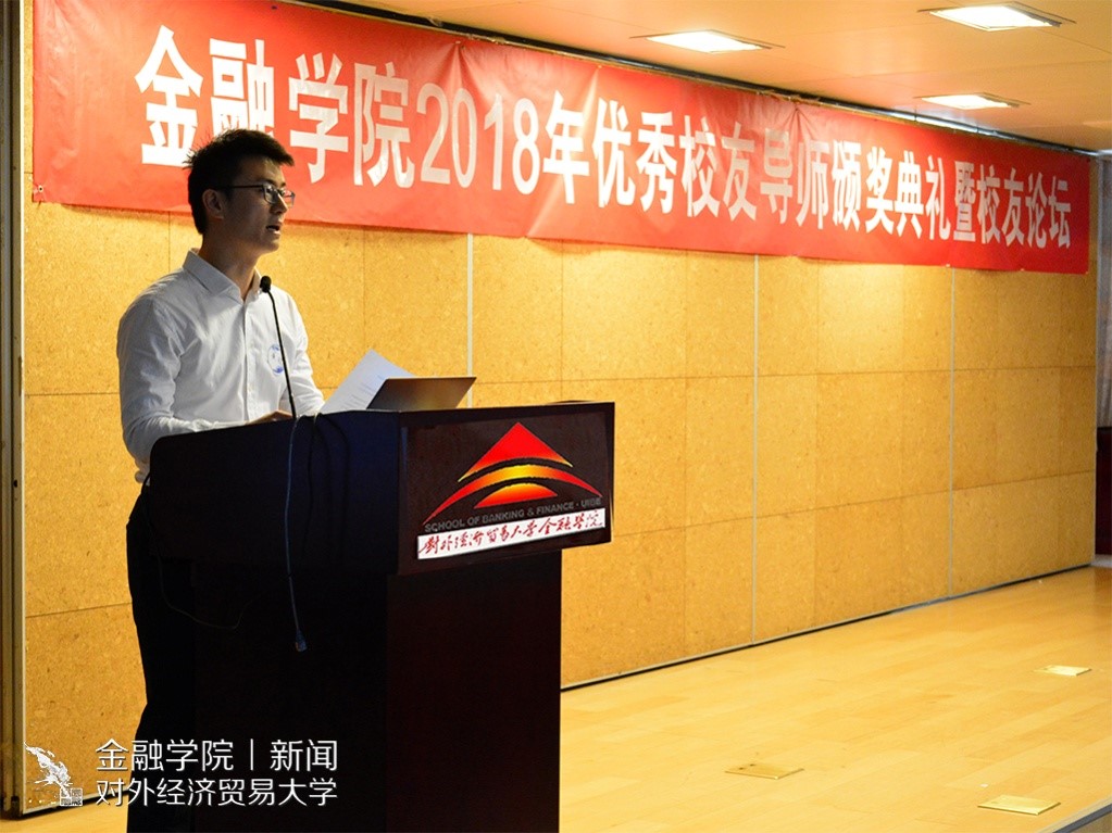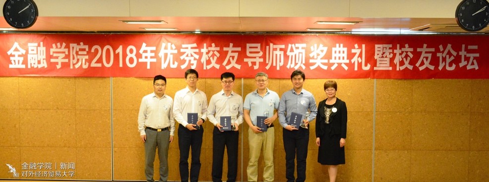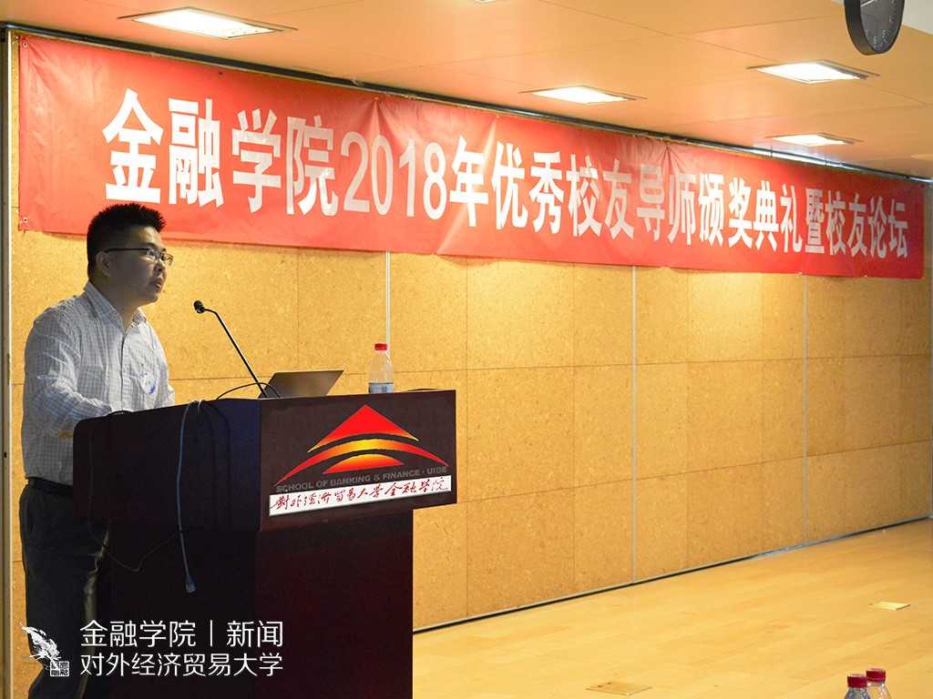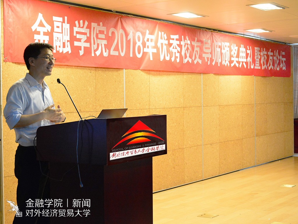 一号娱乐 新闻宣传中心 讯(记者:许蓝天 摄影:陈伊雯)5月13日下午13:30,一号娱乐 2018年优秀校友导师颁奖典礼暨校友论坛在求真楼319就业招聘大厅顺利举行。对外经济贸易大学学生工作部部长陶好飞老师,校友总会秘书长张瑞老师,研究生院常务副院长兼一号娱乐 院长吴卫星教授,一号娱乐 副院长范言慧教授、党委副书记王春蕾老师、校友办公室主任刘莹老师、分团委书记曲小杰老师及各年级辅导员陈玉平、肖明明、吴虹利老师出席了本次活动。优秀校友导师胡农、孙效、崔仕嵬、孙科、唐晶莹、张雯婷、王磊、黄欣出席现场,并与同学们深入交流。