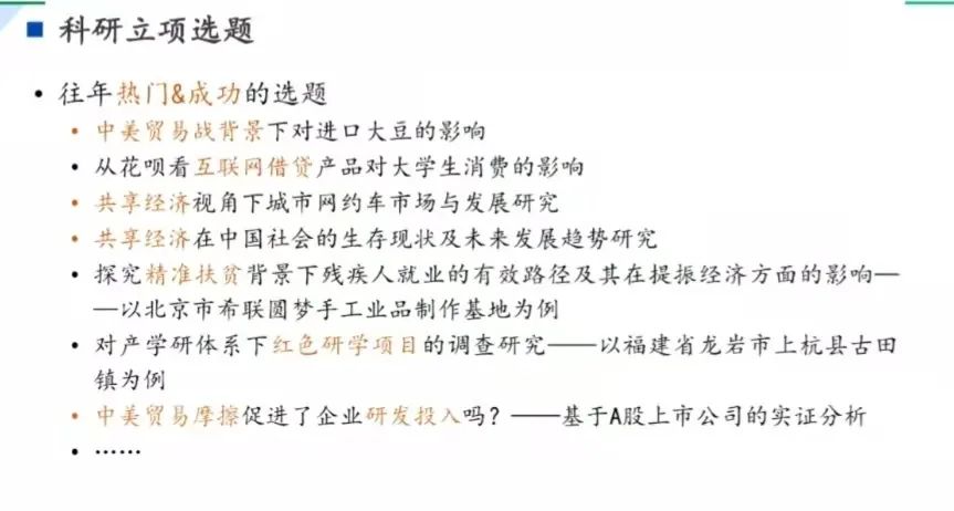 在同学经验分享环节,曾婷婷同学提出了选题可以结合个人兴趣与社会热点,使课题具有实用性,也有研究的价值。同时,她为同学们详细介绍了两种实用的科研方法,重点强调了实证研究法,并推荐了一些较为实用的数据资料库,为同学们在日后搜集数据和查找信息提供了帮助。她建议报告的格式尽量采取“总分总”的模式,突出中心句。在内容方面,她则结合自身经历,建议同学们可以细化自己研究的问题找到挖掘的点。对于基本框架,她推荐同学们以流程图的形式呈现,有利于同学们在开题报告撰写过程中更清晰的表达。