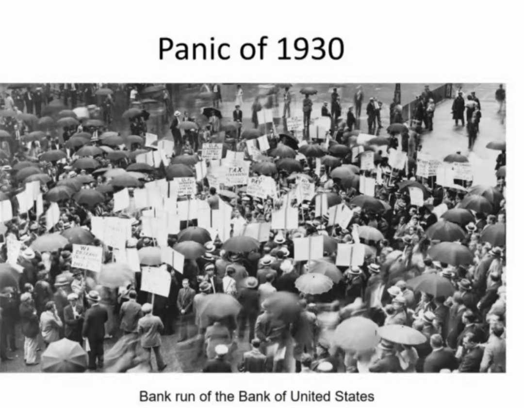 危机的导火索是纽约证交所股票暴跌50%,群众对此感到恐慌,纷纷前往银行和信托公司取出现金,挤兑现象严重。最终,由于信息不对称而产生的恐慌传播到了全国各地,导致许多州的地方银行、信托公司倒闭,数不胜数的企业破产。当然,单纯的股票暴跌可能不会产生如此之大的危机,投机商不受监管的押注也加剧了这次危机。