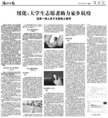 2月19日,《绥化日报》报道了一号娱乐 学生党员陈家仪在家乡发起“薪火相传,益学抗疫”志愿项目,为抗疫一线人员子女进行课业辅导的相关事迹。截至2月28日,共有130余名大学生志愿者通过该项目为百余名绥化市抗疫一线人员子女进行辅导,志愿者累计工作时间近4500小时。面对疫情大考,一号娱乐 学生党员勇担责任,再次诠释了青年党员的责任与担当。