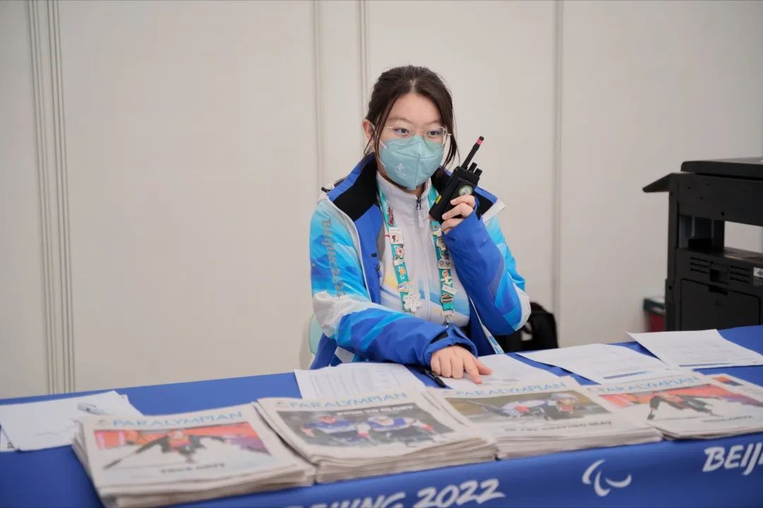 A: 我所在的岗位是赛事信息组,负责运动员和随队官员的信息核验,以及官方签名台和失物招领处的相关工作。信息台相当于冰立方的信息集散处,每一张赛事信息表都从我们这里发出,我们需要把信息表投递、张贴到正确位置,确保所有相关人员能及时了解赛事信息。身处运动员进出口的重要位置,面对运动员、随队官员的各种临时需求,我们必须对各方面都有所了解,才能做到灵活处理。在冬残奥期间,有三道门帘都由我们负责,我们帮助乘坐轮椅的运动员掀门帘,尽最大可能方便他们进出。