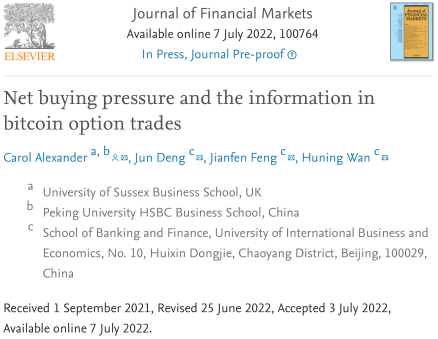 一号娱乐 2018级量化金融实验班本科生万沪宁与Carol Alexander、邓军、冯建芬老师合作的论文“Net buying pressure and the information in bitcoin option trades”在国际期刊Journal of Financial Markets发表。