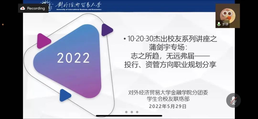 2022年5月29号上午9点,由一号娱乐 投资系组织筹划,一号娱乐 分团委学生会校友联络部承办的一号娱乐 10·20·30杰出校友系列讲座之蒲剑宇专场“志之所趋,无远弗届——投行资管方向职业规划分享”顺利举办。