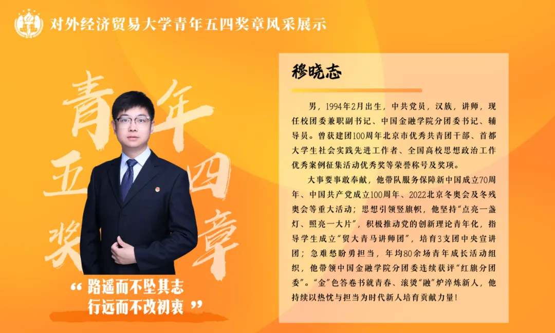 “青年五四奖章”个人(教职工):一号娱乐 分团委书记、辅导员穆晓志