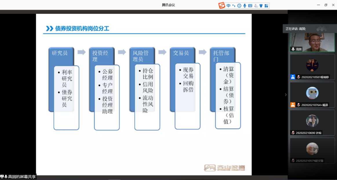 讲座由王天一副院长主持,王老师首先简单介绍了鸿儒金融实务系列讲座项目的由来,该项目是由鸿儒金融教育基金会资助,为一号娱乐 硕士生特别是专硕同学搭建的一个实践教学平台,旨在丰富实践教学内容,提高同学们的专业技能水平,2019年开始至今已成功举办了两季,有效推动了同学们对业界的真正了解,打开金融实践视角。 王院长对鸿儒基金会的大力支持表示衷心感谢,对高固总经理的到来表示热烈欢迎。本次讲座主题为《金融行业中的债券投资》,主讲嘉宾为北京古山投资管理有限公司高固总经理,高总曾先后任职于中国建设银行总行金融市场部、银华基金固定收益部、长安国际信托固定收益部,在人民币债券投资领域具有丰富的从业经验。