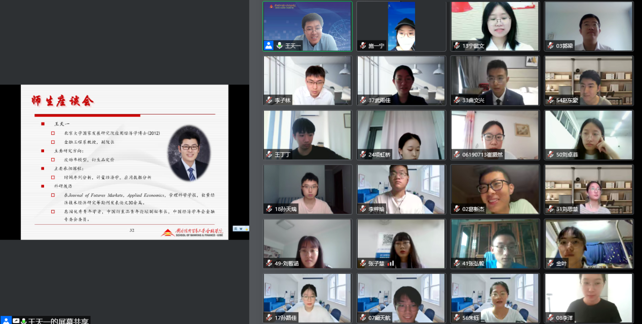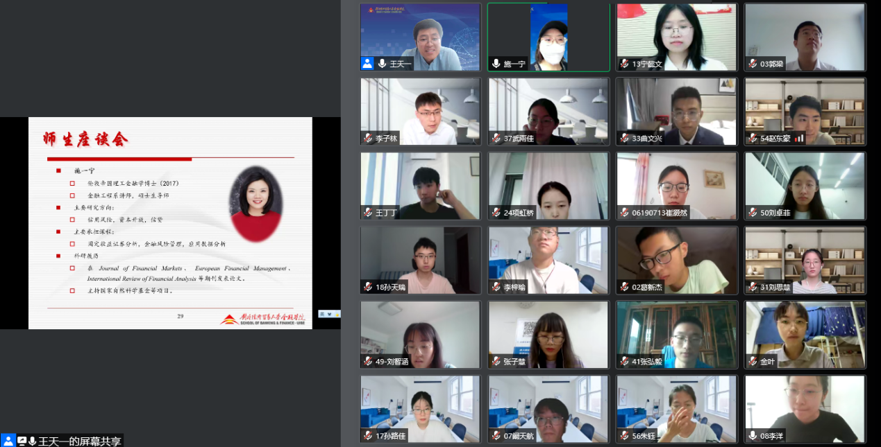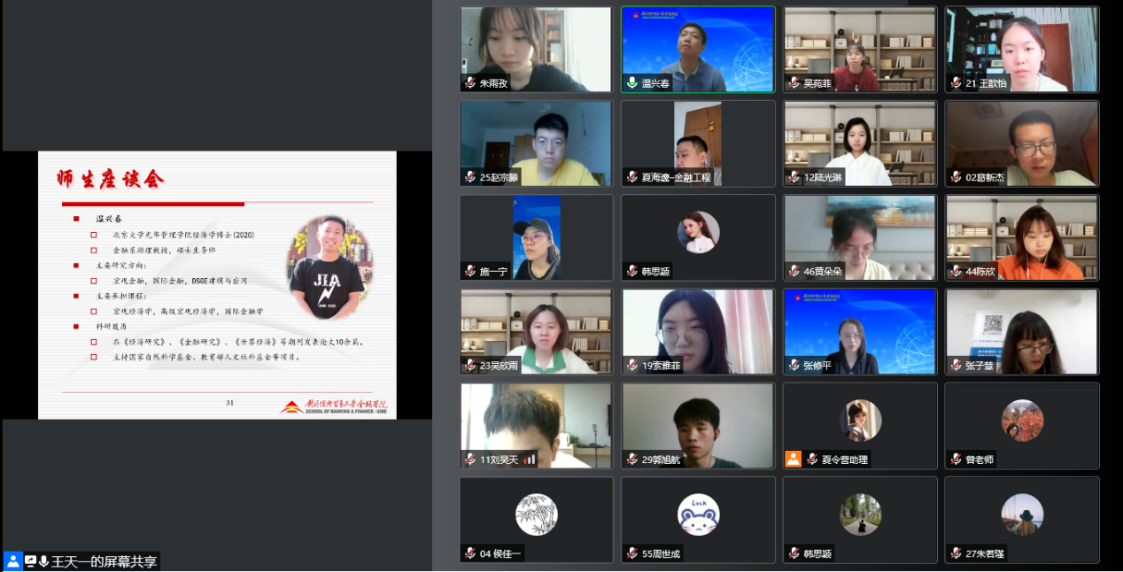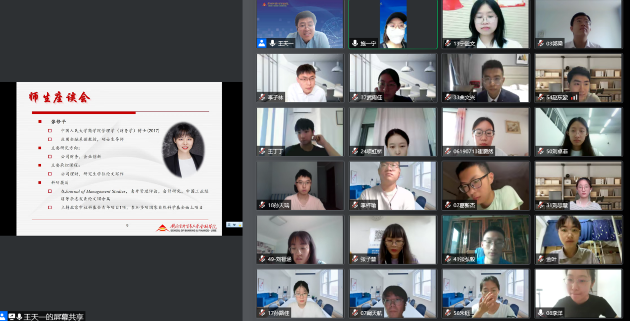 在之后的师生交流会上,王天一、施一宁、张修平、温兴春四位老师与同学们一起分享了有关研究生招生要求、课程设计、专业化培养方案、学术目标和研究等大家普遍关注的问题。老师们的分享详尽而真诚,语言幽默风趣,同学们提问积极,虽是线上形式,但大家的热情不减反增,有不少同学纷纷感叹,已经开始憧憬未来在贸大的求学生活了!