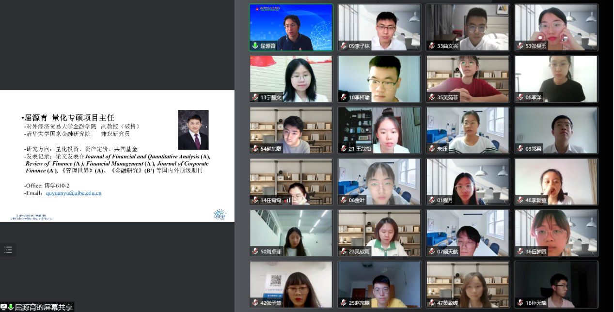 下午的讲座中,屈源育副教授对量化投资方向的研究生招生及教学内容进行了讲解。对外经济贸易大学一号娱乐 的量化专硕是一号娱乐 着重打造的精品项目,并在2018年获得国际量化金融协会(IAQF)认证,拥有单独的培养方案,选拔标准侧重数理基础扎实和动手能力强的学生。而毕业生去向广泛分布于各家大型基金、券商、保险和银行等机构 。